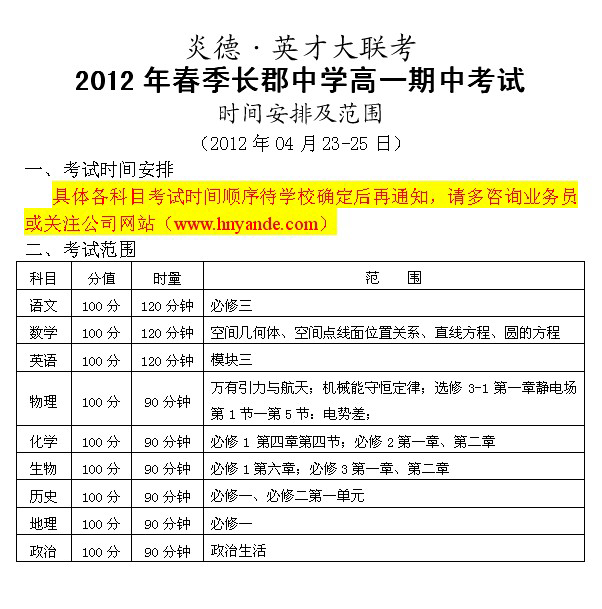 上一篇:2012春季長郡中學高一期末考試時間及范圍