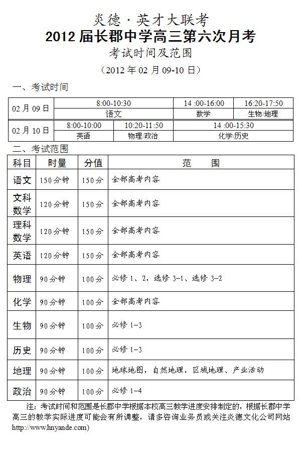炎德英才大聯(lián)考長郡中學(xué)2012屆高三第六次月考考試時(shí)間和范圍