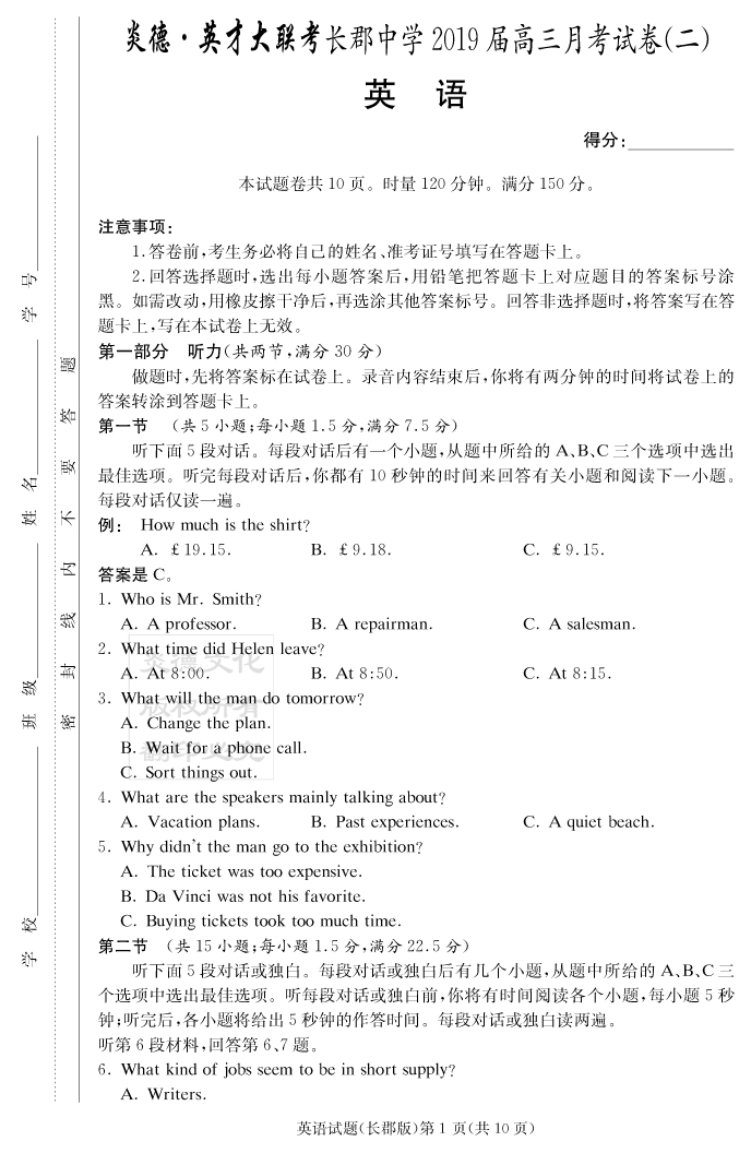 【英語】炎德英才大聯考2019長郡中學高三2次月考
