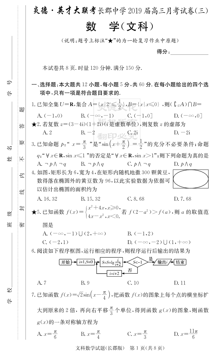 【文數】炎德英才大聯考2019長郡中學高三3次月考