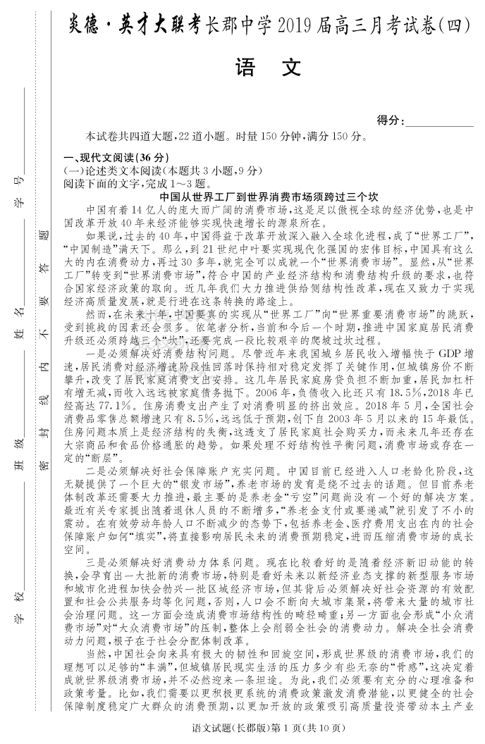 【語文】炎德英才大聯考2019長郡中學高三4次月考
