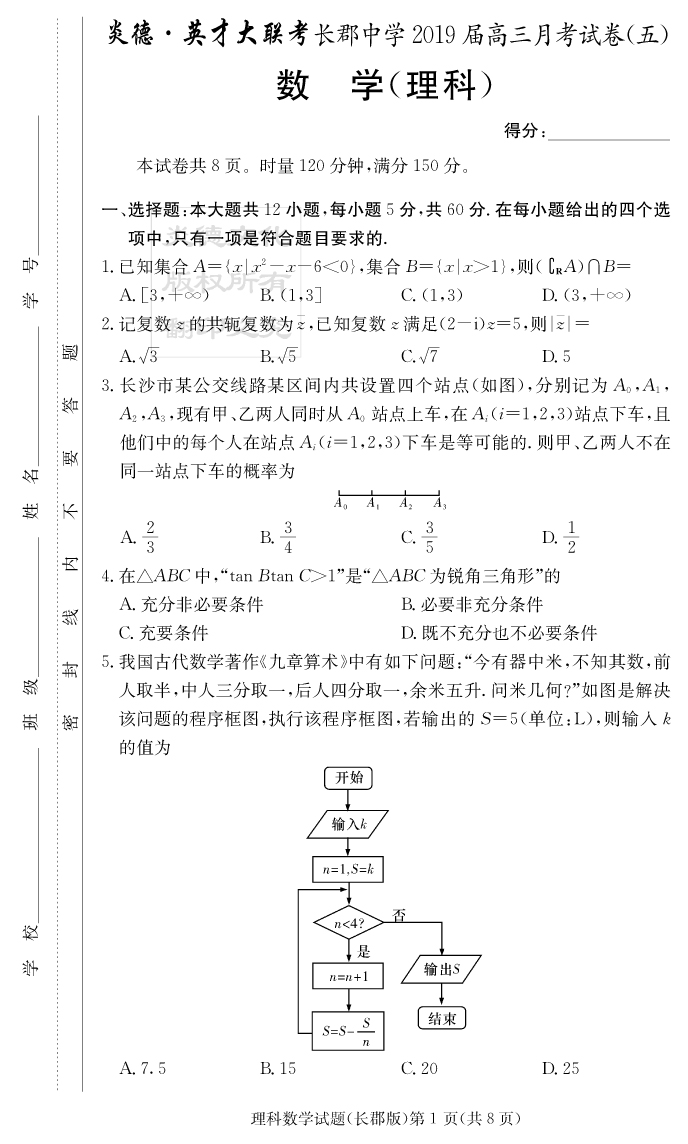 【理數(shù)】炎德英才大聯(lián)考2019長郡中學(xué)高三5次月考