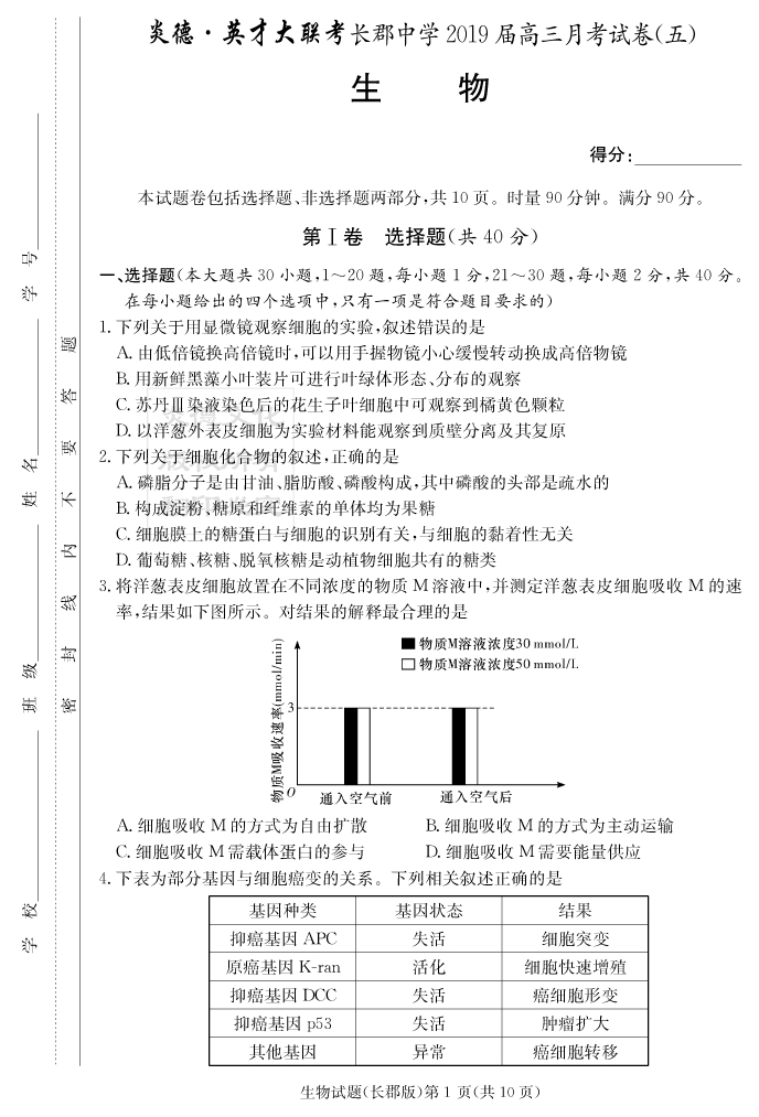 【生物】炎德英才大聯考2019長郡中學高三5次月考