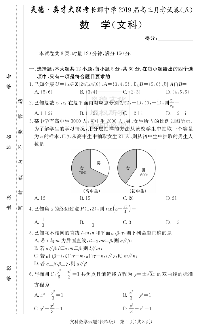 【文數(shù)】炎德英才大聯(lián)考2019長郡中學(xué)高三5次月考