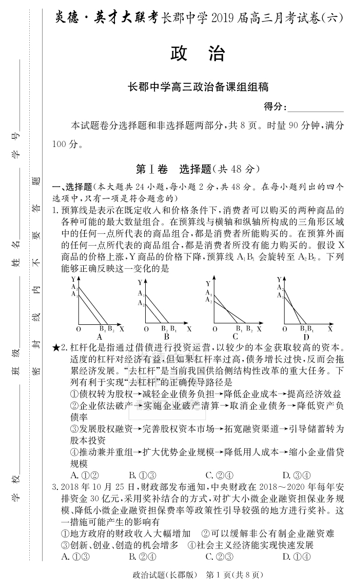 【政治】炎德英才大聯考2019長郡中學高三6次月考