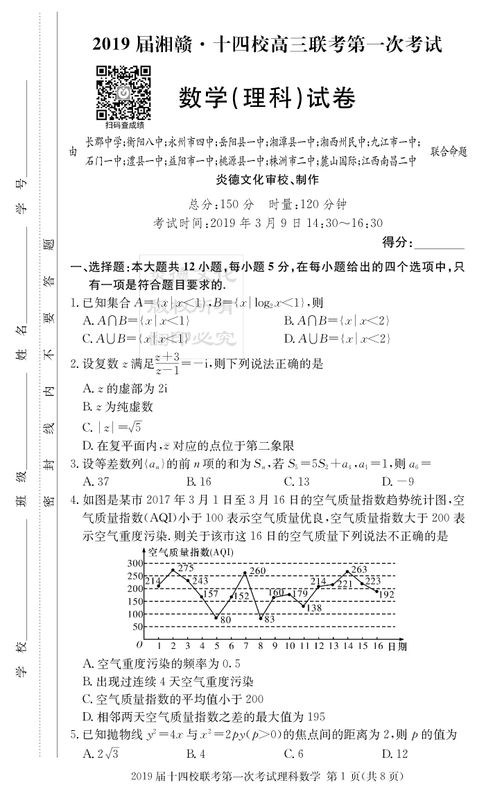 【理數】炎德英才大聯考2019長郡中學高三7次月考(十四校聯考一)