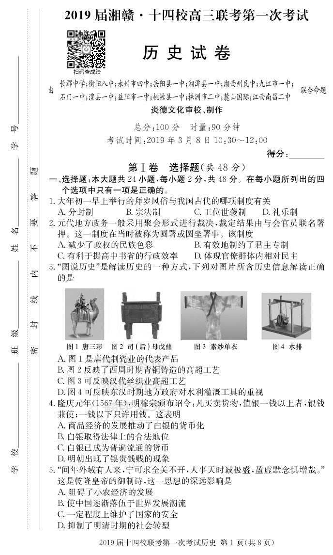 【歷史】炎德英才大聯考2019長郡中學高三7次月考(十四校聯考一)