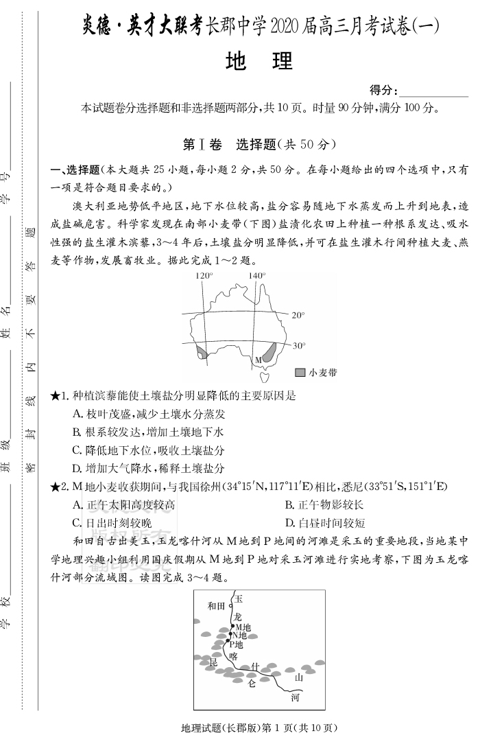 【地理】炎德英才大聯考2020屆長郡中學高三1次月考