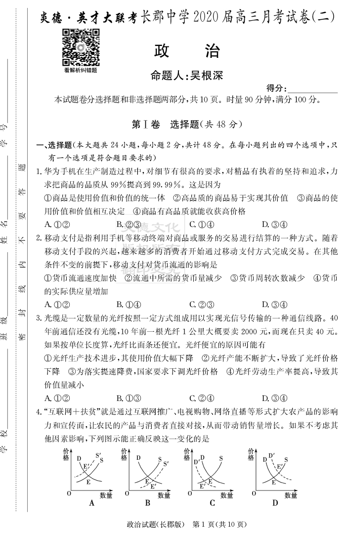 【政治】炎德英才大聯(lián)考2020屆長郡中學(xué)高三2次月考