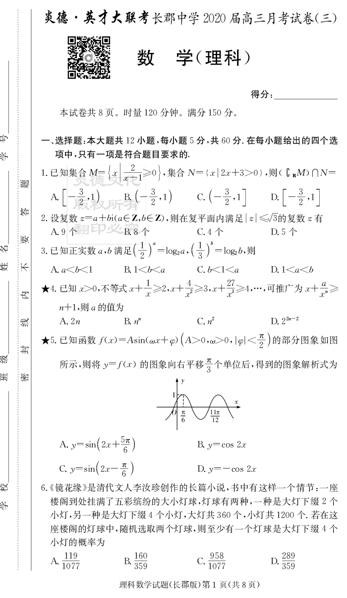 【理數】炎德英才大聯考2020屆長郡中學高三3次月考
