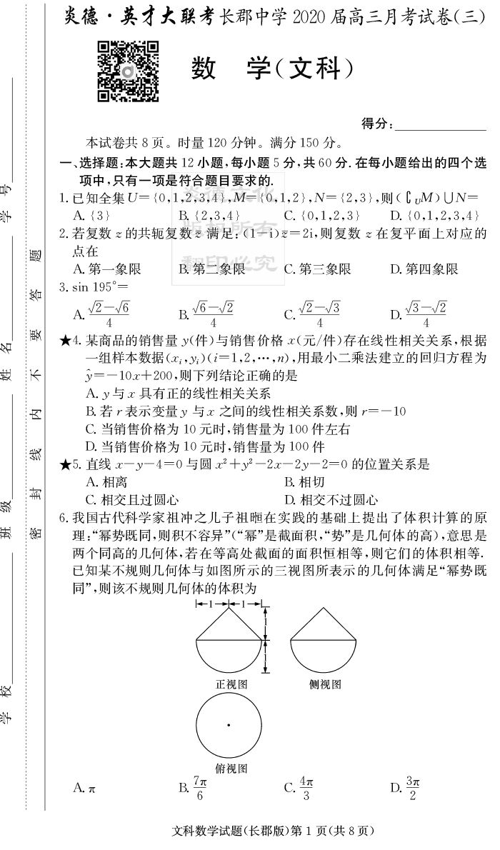 【文數】炎德英才大聯考2020屆長郡中學高三3次月考