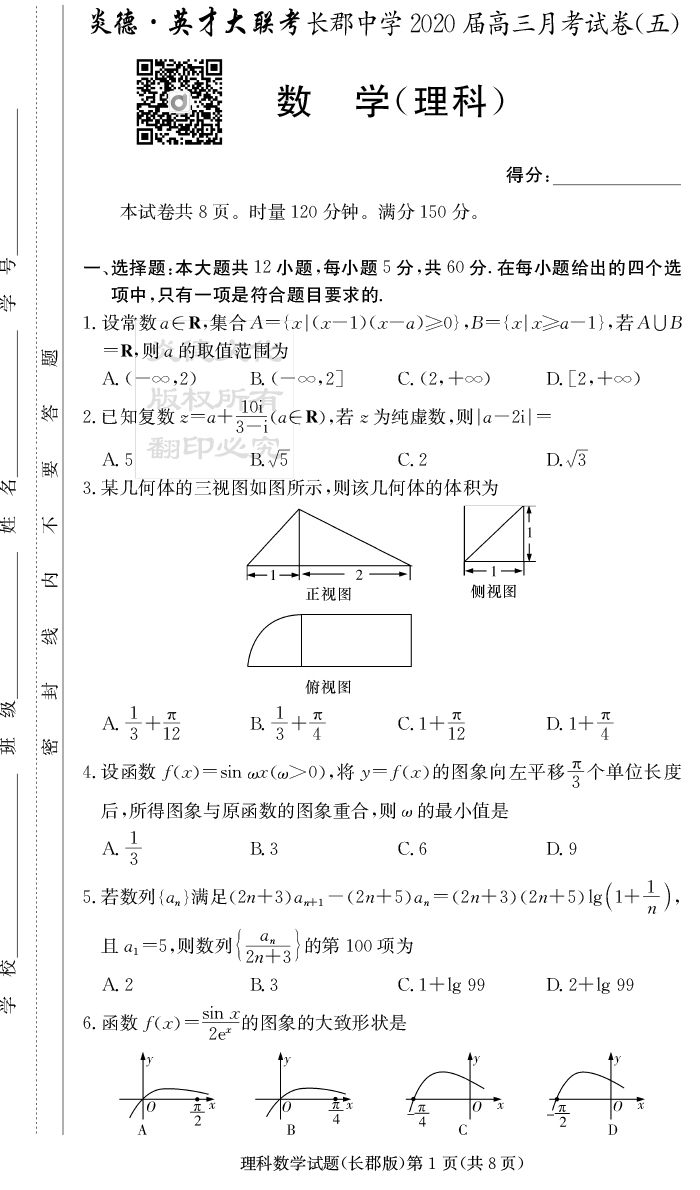 【理數】炎德英才大聯考2020屆長郡中學高三5次月考