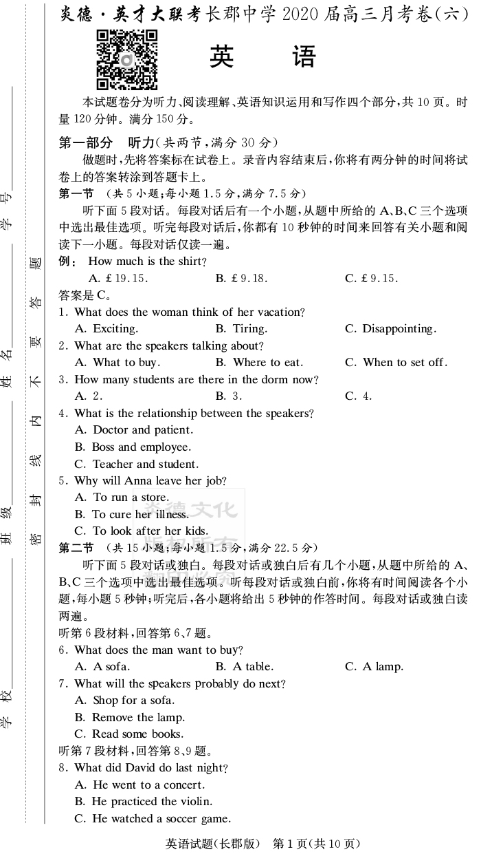 【英語】炎德英才大聯考2020屆長郡中學高三6次月考