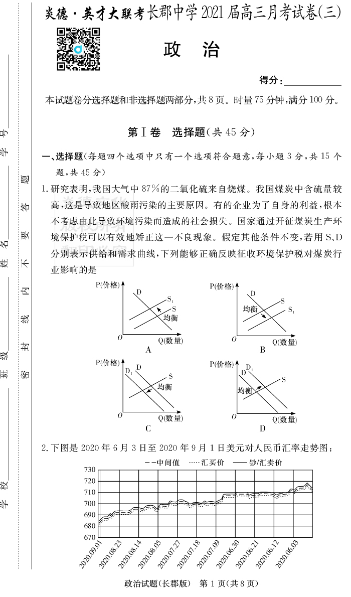 【政治】炎德英才大聯考2021屆長郡中學高三3次月考