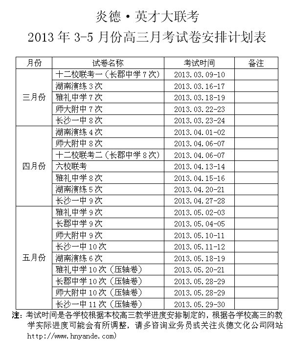 《炎德英才大聯(lián)考》2013年3-5月份高三月考試卷安排計(jì)劃表